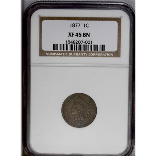 <B>1877<1C> XF45 NGC.</B></I> The key date in this popular series. Both sides are well detailed and there is only one mentionable impairment, that being a small mark in the left obverse field under the Indian's chin. All the letters of LIBERTY are legible, and most of them are sharp. A perfect coin for the collector who is finally ready to add this important coin to their collection.