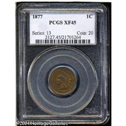 1877 1C XF45 PCGS. The key date in this popular se <B>1877 1C XF45 PCGS.</B></I> The key date in this popular series. Both sides are well detailed and there are no impairments of any kind. All the letters of LIBERTY are legible, and most of them are sharp. A perfect coin for the collector who is finally ready to add this important coin to their collection. <BR><BR><B>Important notice:</B> Heritage usually auctions material at the rate of 200-250 lots per hour. On some occasions eBay Live bid software or the Internet may not be able to keep up with the pace of the auction. We recommend placing a realistic absentee bid now as insurance to avoid disappointment. Occasionally the auctioneer may eliminate or reject an eBay Live bid, and the auctioneer may also reopen a lot after the close of the eBay live bidding (usually because we missed an audience bid), and may reject your bid even if it shows you as the winning bidder. By bidding via eBay Live, you agree that Heritage may award the lot to another bidder at its sole discretion under the circumstances described above or any other reasonable circumstances. Since eBay bids are not shown to us until we open the lot on the floor, we treat those bids just like floor bids. In most cases the floor responds before the eBay bid is presented to us, due to Internet lag time, so for consistency we have made it a policy that floor bids are always considered first over tie eBay live bids. Also please note that all Heritage lots purchased through eBay Live carry a 20% Buyer's Premium. Please make sure you read the Terms and Conditions before you bid. This lot is being auctioned in conjunction with a live floor auction by Heritage Galleries & Auctioneers. All final auction and invoice information will be supplied by Heritage Galleries & Auctioneers, and all other information should be considered preliminary. Lot:5092