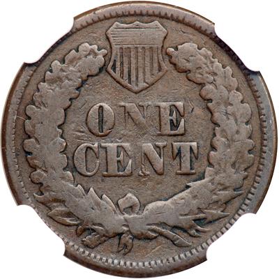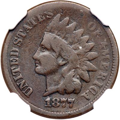 1877 1¢ Indian. NGC graded Good-6 Brown. A Popular key date. Only 852,500 minted. Full clear legends on both sides, although LIBERTY no longer visible on the headband. In a new 4 pronged NGC holder.
