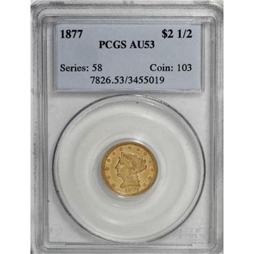 <B>1877 $2 1/2 AU53 PCGS.</B></I> Boldly struck with an interplay of lime-gold and reddish coloration over both sides. The surfaces display a noteworthy lack of abrasions. Faintly worn with a few wispy hairlines in the fields. Only 1,632 business strikes were produced. <BR><BR><b>Shipping:</b> Coins & Currency (<a target="_blank" href="http://www.heritageauctions.com/common/shipping.php">view shipping information</a>)