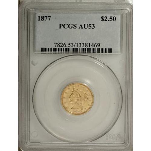 <B>1877 $2 1/2 AU53 PCGS.</B></I> The subtle green-gold of the fields complements pale yellow devices. Well struck with significant remaining luster and only faint abrasions. This low-mintage quarter eagle issue has a mintage of only 1,652 pieces. Population: 9 in 53, 38 finer (11/07).<BR><BR><B>Coin Engraver:</B> Christian Gobrecht<BR><BR><b>Shipping:</b> Coins & Currency (<a target="_blank" href="http://www.heritageauctions.com/common/shipping.php">view shipping information</a>)