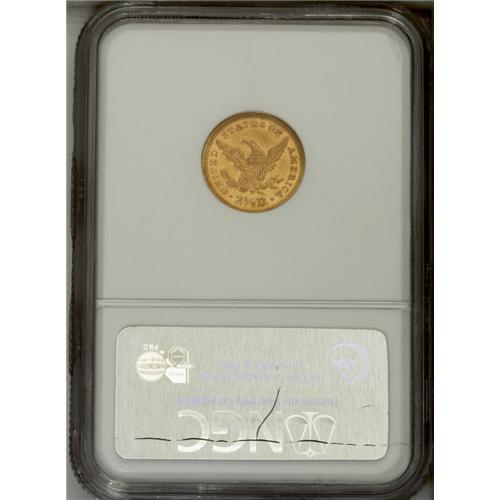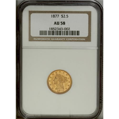 <B>1877 $2 1/2 AU58 NGC.</B></I> A lovely orange-gold example that has minor friction. The surfaces are partially reflective, as expected for the tiny mintage of 1,652 pieces. Census: 33 in 58, 20 finer (10/06).<BR><BR><b>Shipping:</b> Coin/Currency (<a target="_blank" href="http://www.heritageauctions.com/common/shipping.php">view shipping information</a>)