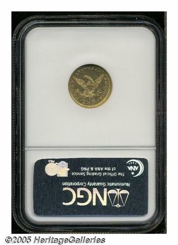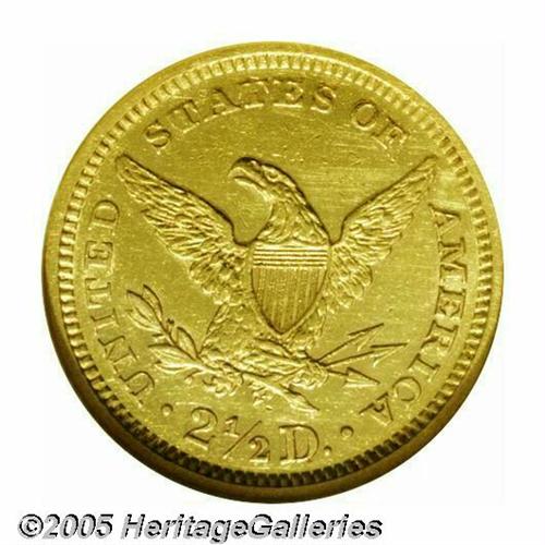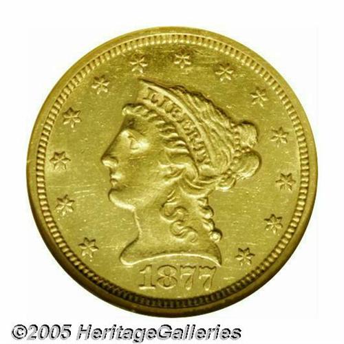 <B>1877<$2 1/2> AU58 NGC.</B></I> Only 1,632 business strikes were minted of this rare date and quality examples such as that offered here are seldom found. The highly lustrous prooflike fields and frosty central devices create a subtle cameo appearance that is mainly free of unsightly marks of any consequence. A pleasing blend of rarity and quality that will certainly delight any discriminating Quarter Eagle specialist. Population: 26 in 58, 18 finer (4/05).
