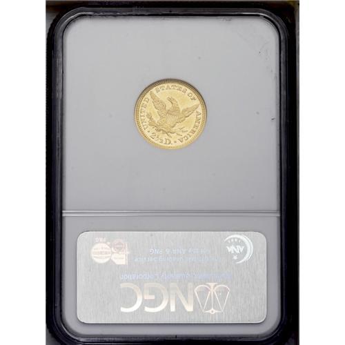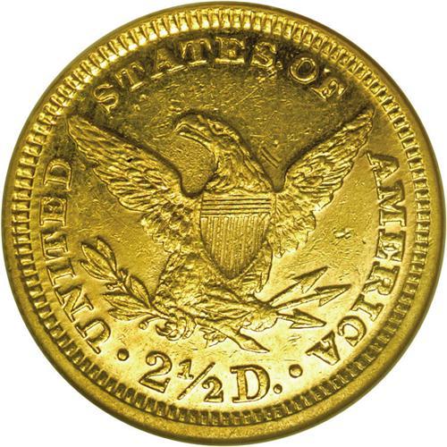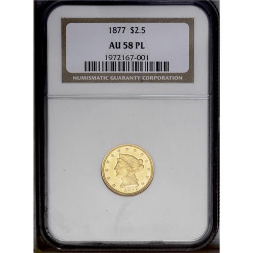 <B>1877<$2 1/2> AU58 Prooflike NGC.</B></I> The fields are fully prooflike except where they are marred by light abrasions. The design elements are slightly weak in the usual locations. This is an extremely low-mintage issue, with a total production of just 1,632 coins. Few have survived in any grade. Census: 3 in 58, 1 finer (3/06). <BR><BR><B>Important notice:</B> Heritage usually auctions material at the rate of 200-250 lots per hour. On some occasions eBay Live bid software or the Internet may not be able to keep up with the pace of the auction. We recommend placing a realistic absentee bid now as insurance to avoid disappointment. Occasionally the auctioneer may eliminate or reject an eBay Live bid, and the auctioneer may also reopen a lot after the close of the eBay live bidding (usually because we missed an audience bid), and may reject your bid even if it shows you as the winning bidder. By bidding via eBay Live, you agree that Heritage may award the lot to another bidder at its sole discretion under the circumstances described above or any other reasonable circumstances. Since eBay bids are not shown to us until we open the lot on the floor, we treat those bids just like floor bids. In most cases the floor responds before the eBay bid is presented to us, due to Internet lag time, so for consistency we have made it a policy that floor bids are always considered first over tie eBay live bids. Also please note that all Heritage lots purchased through eBay Live carry a 20% Buyer's Premium. Please make sure you read the Terms and Conditions before you bid. This lot is being auctioned in conjunction with a live floor auction by Heritage Galleries & Auctioneers. All final auction and invoice information will be supplied by Heritage Galleries & Auctioneers, and all other information should be considered preliminary. Lot:2432 <BR><BR><B>Winning Notification and Billing:</B> After the FINAL session in this auction is complete, Heritage will send e-mail and snail mail invoices. This process normally takes several days. All final auction and invoice information will be supplied by Heritage Galleries & Auctioneers, and all other information should be considered preliminary. <BR><BR>This auction will be conducted on a live auction floor and over the Internet through eBay Live. If you choose to place an absentee bid, please take a moment to <font color='#0000ff'><u><a href='http://pages.ebay.com/liveauctions/help/before/laabsentee.html'>learn how eBay Live absentee bidding works</a></u></font><font color='#000000'>