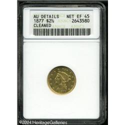 1877 $2 1/2 --Cleaned--ANACS. AU Details, Net XF45. <B>1877 $2 1/2 --Cleaned--ANACS. AU Details, Net XF45.</B></I> Light hairlines are seen on yellow-gold surfaces. The design features are well struck up throughout. <BR><BR><B>Important notice:</B> Heritage usually auctions material at the rate of 200-250 lots per hour. On some occasions eBay Live bid software or the Internet may not be able to keep up with the pace of the auction. We recommend placing a realistic absentee bid now as insurance to avoid disappointment. Occasionally the auctioneer may eliminate or reject an eBay Live bid, and the auctioneer may also reopen a lot after the close of the eBay live bidding (usually because we missed an audience bid), and may reject your bid even if it shows you as the winning bidder. By bidding via eBay Live, you agree that Heritage may award the lot to another bidder at its sole discretion under the circumstances described above or any other reasonable circumstances. Since eBay bids are not shown to us until we open the lot on the floor, we treat those bids just like floor bids. In most cases the floor responds before the eBay bid is presented to us, due to Internet lag time, so for consistency we have made it a policy that floor bids are always considered first over tie eBay live bids. Also please note that all Heritage lots purchased through eBay Live carry a 20% Buyer's Premium. Please make sure you read the Terms and Conditions before you bid. This lot is being auctioned in conjunction with a live floor auction by Heritage Galleries & Auctioneers. All final auction and invoice information will be supplied by Heritage Galleries & Auctioneers, and all other information should be considered preliminary. Lot:6514