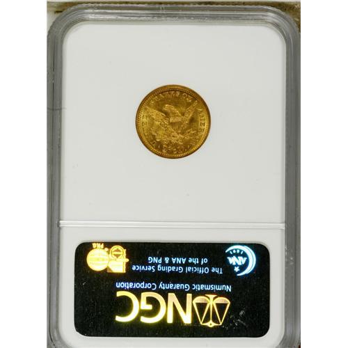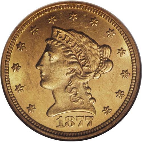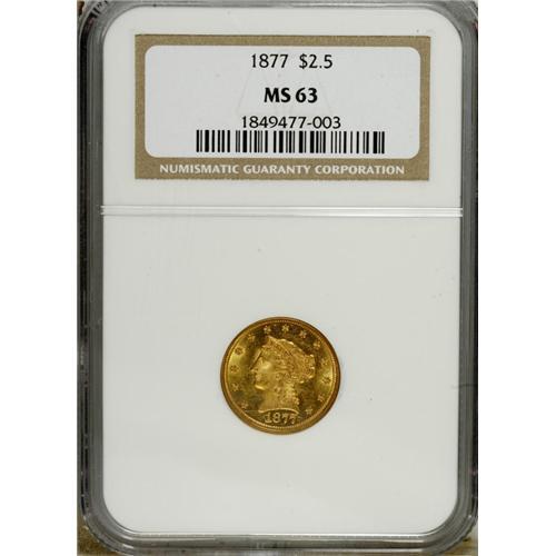 <B>1877 $2 1/2 MS63 NGC.</B></I> Despite having one of the lowest mintages of the series (1,632 business strikes), a fair number are extant today, mostly in the AU levels of preservation. Mint State pieces, on the other hand, are scarce to rare. The MS63 coin in this lot is sharply and evenly struck and possesses lovely peach-gold luster. A handful of minute ticks defines the grade. Census: 5 in 63, 3 finer (1/07).<BR><BR><b>Shipping:</b> Coins & Currency (<a target="_blank" href="http://www.heritageauctions.com/common/shipping.php">view shipping information</a>)