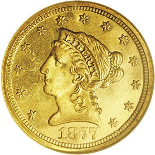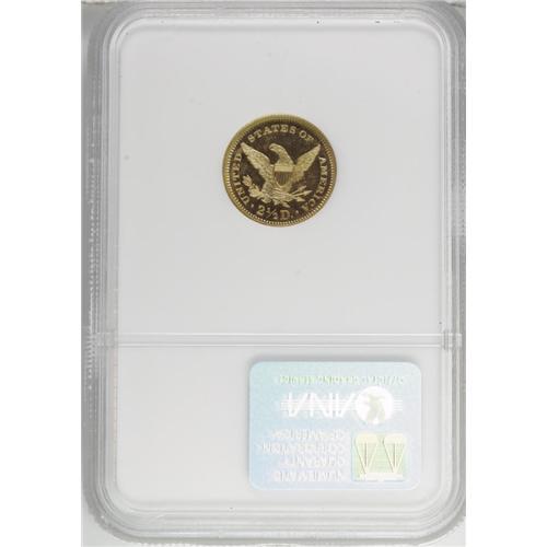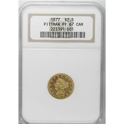 <B>1877 $2 1/2 PR67 Cameo NGC.</B></I> Ex: Pittman. Light original honey patina graces the portrait and fields on this exquisitely struck and flashy Superb Gem. The surfaces are virtually pristine, as expected from the grade. A trio of tiny curly lintmarks, as struck, on the lower right reverse identifies this exemplary specimen. Just 20 proof 1877 quarter eagles were struck. NGC and PCGS have certified 11 pieces in all grades, likely including resubmissions. While proof double eagles command numismatic headlines, pre-1880 proof quarter eagles are also extremely rare and can be acquired for significantly less, despite their infrequent auction appearances.<BR><I>Ex: 2004 ANA Signature Auction (Heritage, 8/04), lot 7184; John Jay Pittman Collection, Part Two (David Akers, 5/98), lot 1836, which realized $26,800. Pittman bought the piece from Abe Kosoff's 1956 Thomas Melish sale (lot 1289) for $130.</B></I><BR><I>From The RNB Collection.</B></I><BR><BR><b>Shipping:</b> Coin/Currency (<a target="_blank" href="http://www.heritageauctions.com/common/shipping.php">view shipping information</a>)