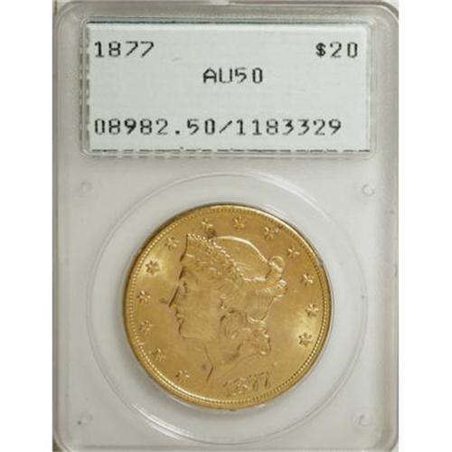 <B>1877 $20 AU50 PCGS.</B></I> PCGS Population (38/578). NGC Census: (5/726). Mintage: 397,670. Numismedia Wsl. Price for NGC/PCGS coin in AU50: $790. (#8982)<BR><BR><B>Coin Engraver:</B> James B. Longacre<BR><BR><b>Shipping:</b> Coins & Currency (<a target="_blank" href="http://www.heritageauctions.com/common/shipping.php">view shipping information</a>)