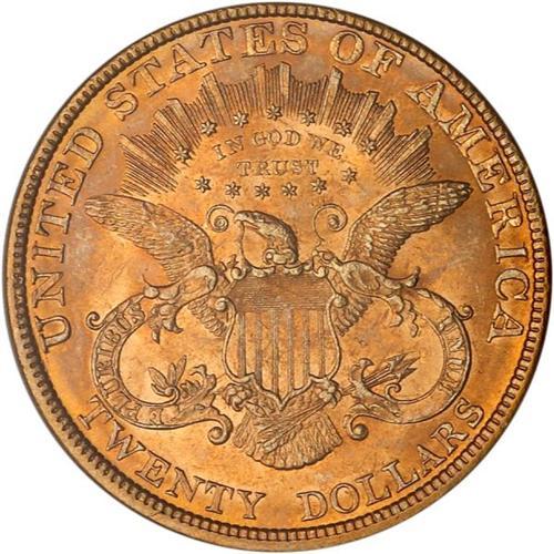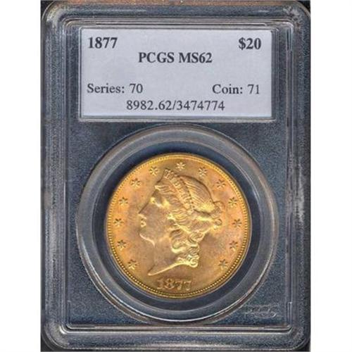 <b>1877 $20 Liberty. PCGS graded MS62.</b> A handsome beginning to the well-liked, finely designed Type 3 double eagle (1877-1907) and a fitting reminder just how lustrous these once looked. Color is mostly orange-gold in shade, but flickers of copper tinted iridescence can be found, with complete frostiness throughout although hampered in its grade slightly by the usual randomness of bagmarks <b>(PCGS # 8982)</b> <i>