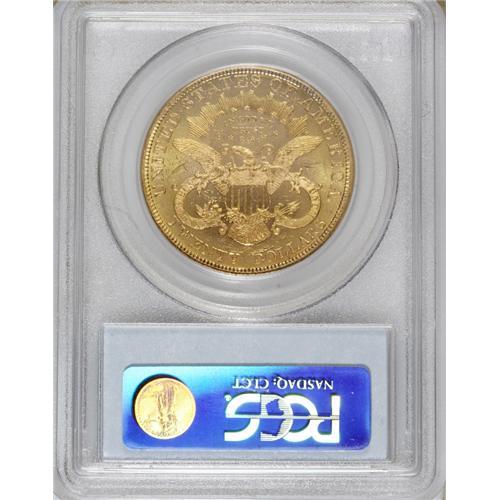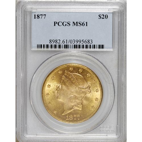 <B>1877 $20 MS61 PCGS.</B></I> This first-year Type Three twenty has a prooflike reverse, although the obverse displays cartwheel luster. The cheek has its share of faint grazes, but the strike is bold throughout.<BR><BR><b>Shipping:</b> Coins & Currency (<a target="_blank" href="http://www.heritageauctions.com/common/shipping.php">view shipping information</a>)
