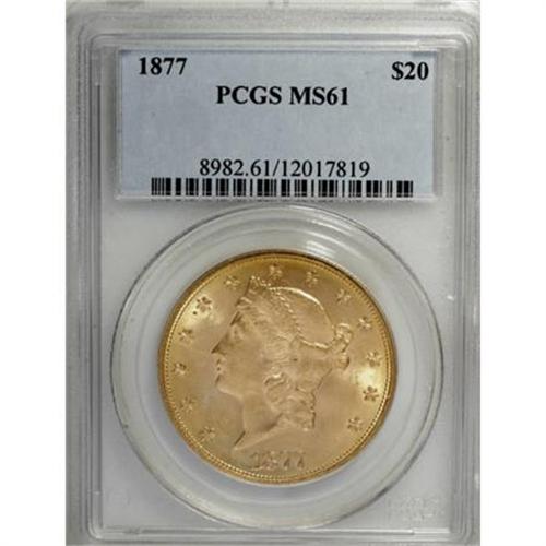 <B>1877 $20 MS61 PCGS.</B></I> A peach-gold example with a bold strike and terrific luster. Extremely clean, except for some hairlines on the lower portion of the obverse that are noted. <BR><I>From The York/Hallenbeck #2 Current Finest PCGS Registry Set of Liberty Double Eagles.</B></I><BR><BR><B>Coin Engraver:</B> James B. Longacre<BR><BR><b>Shipping:</b> Coins & Currency (<a target="_blank" href="http://www.heritageauctions.com/common/shipping.php">view shipping information</a>)
