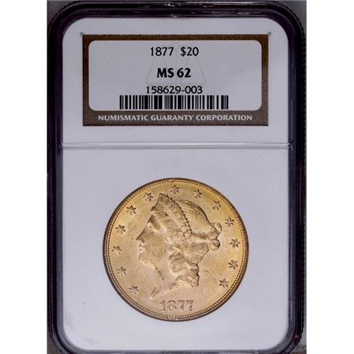 <B>1877<$20> MS62 NGC.</B></I> The 1877 is a scarce coin in any Mint State grade. This MS62 specimen is sharply delineated and possesses apricot-gold surfaces with a nearly unbroken luster flow. Several abrasions and luster grazes occur on Liberty's cheek and neck and in the obverse fields. Census: 76 in 62, 11 finer (4/06).