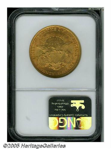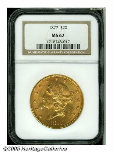 <B>1877<$20> MS62 NGC.</B></I> Unusually vivid red-orange and mint-green toning adorns each side of this crisply struck example. Highly lustrous, the coin has a bright frosty sheen and a normal number of abrasions, for the MS62 grade level. First year of the Type Three design, and a moderate scarcity in Mint State. Population: 83 in 62, 52 finer (6/05).