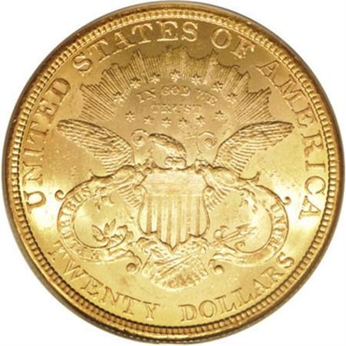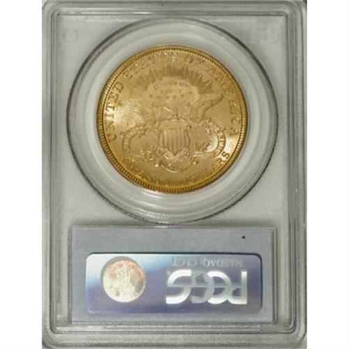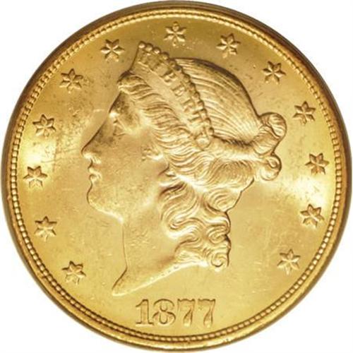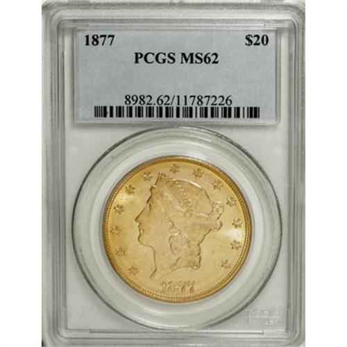 <B>1877 $20 MS62 PCGS.</B></I> This issue, the first for P-mint Type Three double eagles, has a mintage of just under 400,000 pieces and a comparatively low survival rate in Mint State. This decisively struck and flashy example offers plenty of luster and detail. A number of light, scattered abrasions on each side account for the grade. PCGS has graded just 14 finer representatives (7/07).<BR><BR><B>Coin Engraver:</B> James B. Longacre<BR><BR><b>Shipping:</b> Coins & Currency (<a target="_blank" href="http://www.heritageauctions.com/common/shipping.php">view shipping information</a>\)