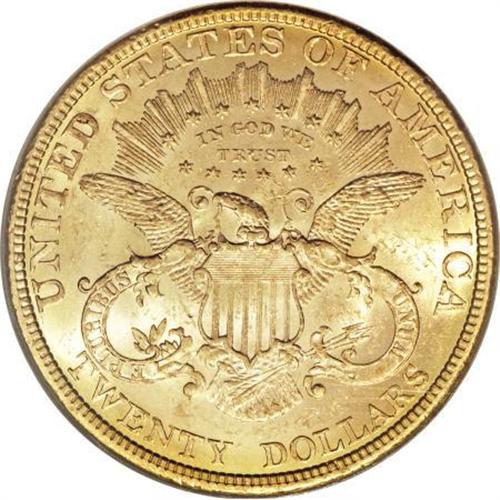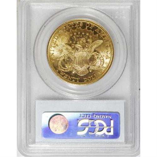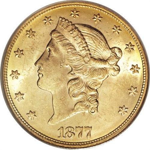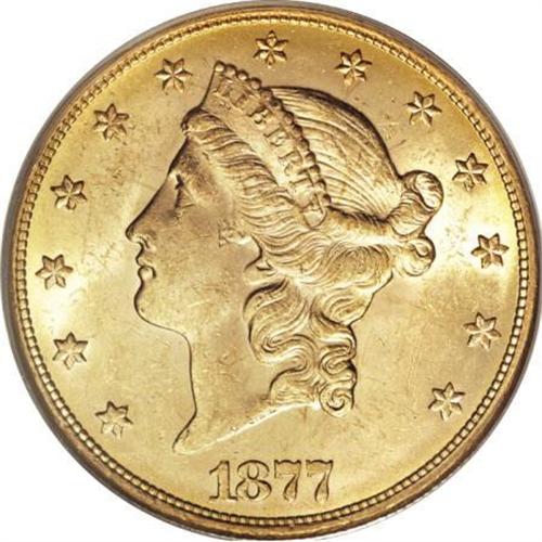 <B>1877 $20 MS62 PCGS.</B></I> This issue, the first for P-mint Type Three double eagles, has a mintage of just under 400,000 pieces and a comparatively low survival rate in Mint State. This sharply struck and flashy example offers plenty of luster and detail. A number of light, scattered abrasions on each side account for the grade. PCGS has graded just 14 finer representatives (3/08).<BR><BR><B>Coin Engraver:</B> James B. Longacre<BR><BR><b>Shipping:</b> Coins & Currency (<a target="_blank" href="http://www.heritageauctions.com/common/shipping.php">view shipping information</a>)