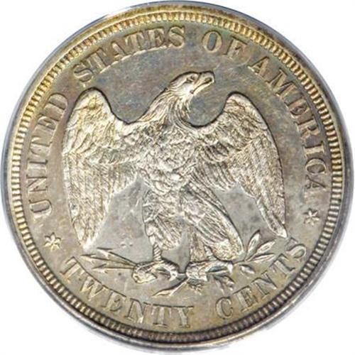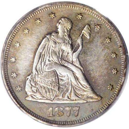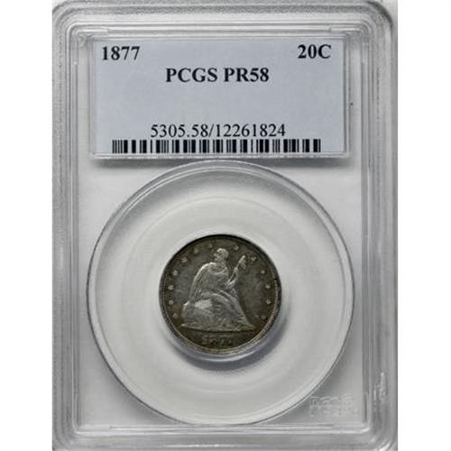 <B>1877 20C PR58 PCGS.</B></I> Although a proof only issue, a few 1877 twenty cent pieces saw their way into the channels of commerce. This is one of these pieces, which despite the obviously mirrored surfaces and high quality details of a proof, nonetheless displays signs of light wear, most notably on the obverse. Predominantly bright silver in color, with blue and gold color visible in the peripheries. A few surface abrasions are typical of a coin that has spent a short time being spent.<BR><I>From The John Stimson, Sr. Collection, Part One.</B></I><BR><BR><B>Coin Engraver:</B> William Barber<BR><BR><b>Shipping:</b> Coins & Currency (<a target="_blank" href="http://www.heritageauctions.com/common/shipping.php">view shipping information</a>)