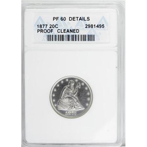 <B>1877 20C --Cleaned--ANACS. PR60 Details.</B></I> A well executed strike translates into crisp definition on the design elements of this proof-only twenty cent piece. Essentially brilliant surfaces reveal fine hairlines, and just hints of barely discernible light gold color occur around some of the devices. A few minuscule indentations, most likely mint made, are noted in the obverse fields.<BR><BR><b>Shipping:</b> Coins & Currency (<a target="_blank" href="http://www.heritageauctions.com/common/shipping.php">view shipping information</a>)