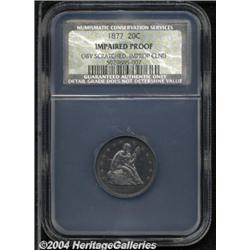 <B>1877<20C> PR60 Details, Obverse Scratched, Improperly Cleaned, NCS.</B></I> The deep mauve patina is somewhat lighter in the centers. Well struck, but the fields exhibit wispy hairlines and the left obverse has a few scratches. A proof-only issue, and a short-lived type coin. <BR><BR><B>Important notice:</B> Heritage usually auctions material at the rate of 200-250 lots per hour. On some occasions eBay Live bid software or the Internet may not be able to keep up with the pace of the auction. We recommend placing a realistic absentee bid now as insurance to avoid disappointment. Occasionally the auctioneer may eliminate or reject an eBay Live bid, and the auctioneer may also reopen a lot after the close of the eBay live bidding (usually because we missed an audience bid), and may reject your bid even if it shows you as the winning bidder. By bidding via eBay Live, you agree that Heritage may award the lot to another bidder at its sole discretion under the circumstances described above or any other reasonable circumstances. Since eBay bids are not shown to us until we open the lot on the floor, we treat those bids just like floor bids. In most cases the floor responds before the eBay bid is presented to us, due to Internet lag time, so for consistency we have made it a policy that floor bids are always considered first over tie eBay live bids. Also please note that all Heritage lots purchased through eBay Live carry a 20% Buyer's Premium. Please make sure you read the Terms and Conditions before you bid.