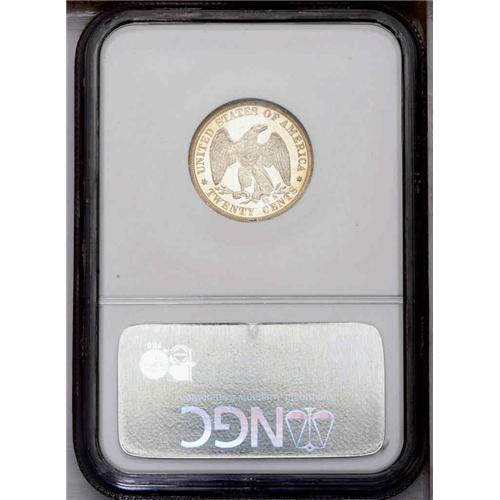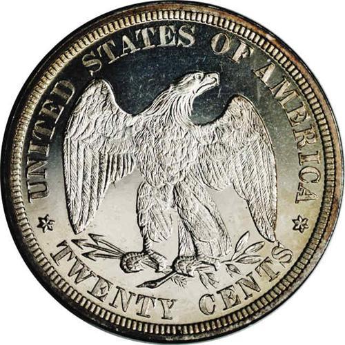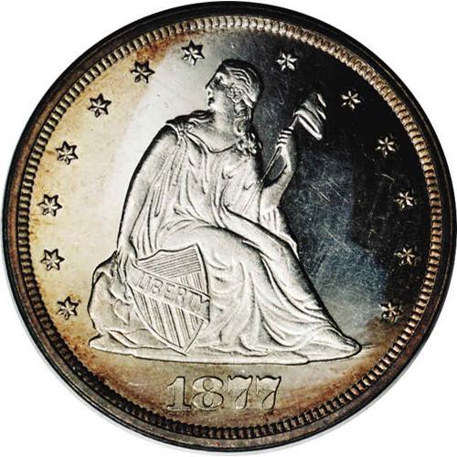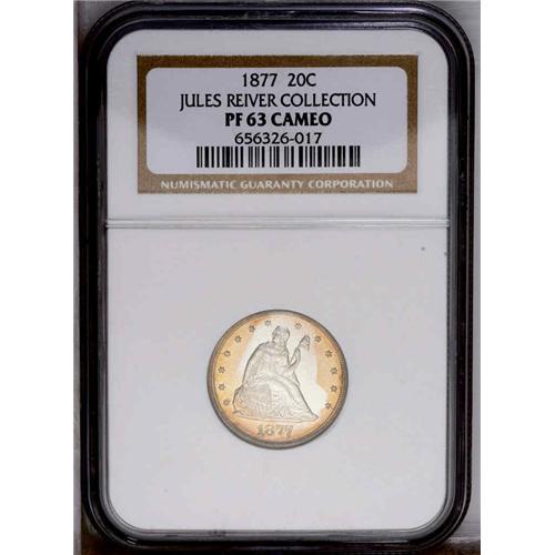 <B>1877<20C> PR63 Cameo NGC.</B></I> The frosty devices contrast beautifully with the glittering mirror fields. The reverse is fully brilliant. The obverse is brilliant at the center with blushes and wisps of orange-gold at the border. Virtually all design features exhibit bold definition, save for some of the fine details of Liberty's hair. A desirable proof-only issue, with a scant mintage of just 350 pieces, by far the lowest production figure in the short-lived twenty cent piece series; the much rarer 1876-CC had a mintage of 10,000 pieces, but its rarity can be accounted for by the fact that the vast majority of these pieces were melted before they could be issued.