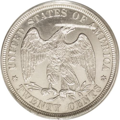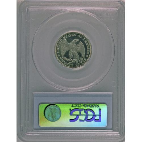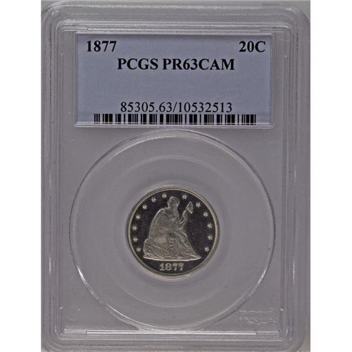 <B>1877<20C> PR63 Cameo PCGS.</B></I> The brilliant fields are glassy pools of deep reflectivity, and the well made devices are fully frosted, producing stark cameo contrast on both obverse and reverse. Only Liberty's head is slightly weak, and a tiny lintmark (as struck) resides on the left side of her face. The coin seems contact-free, but faint hairlines preclude a higher grade.