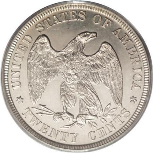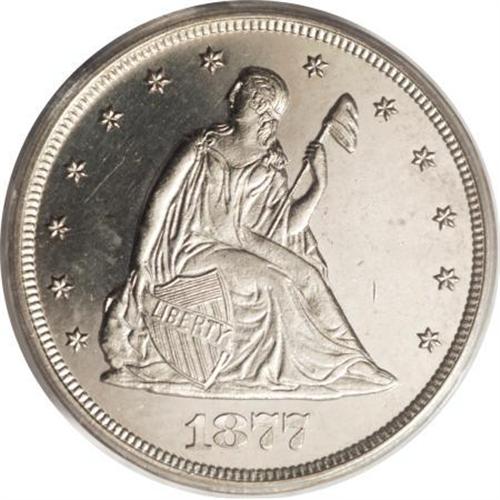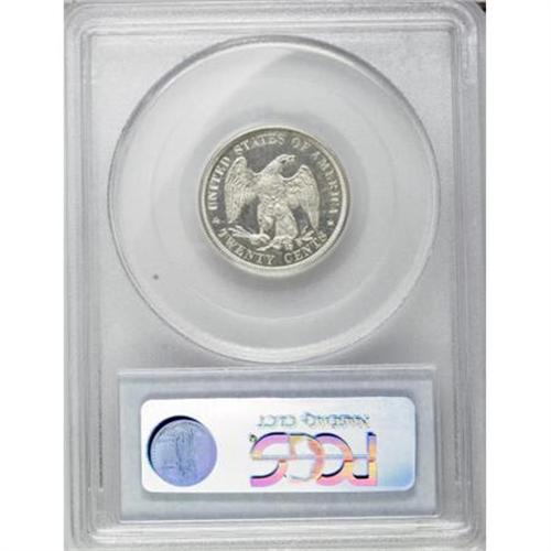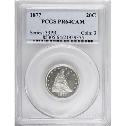 <B>1877 20C PR64 Cameo PCGS.</B></I> This untoned proof-only near-Gem has icy devices and glittering fields. The strike is unimprovable throughout. Carefully preserved and attractive. The lowest mintage issue of this scarce proof type. A scant 350 proofs were struck. Population: 13 in 64 Cameo, 7 finer (5/07).<BR><BR><b>Shipping:</b> Coins & Currency (<a target="_blank" href="http://www.heritageauctions.com/common/shipping.php">view shipping information</a>)
