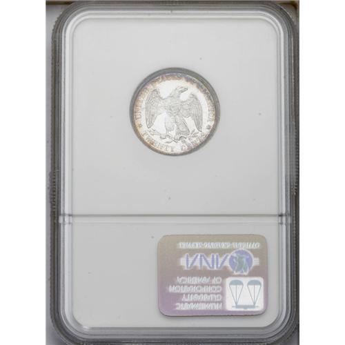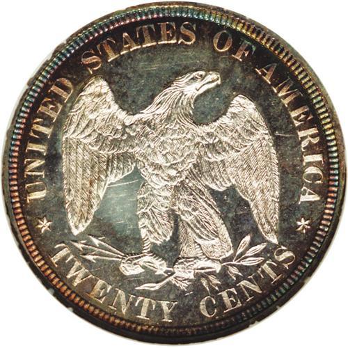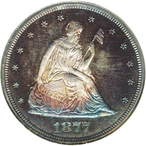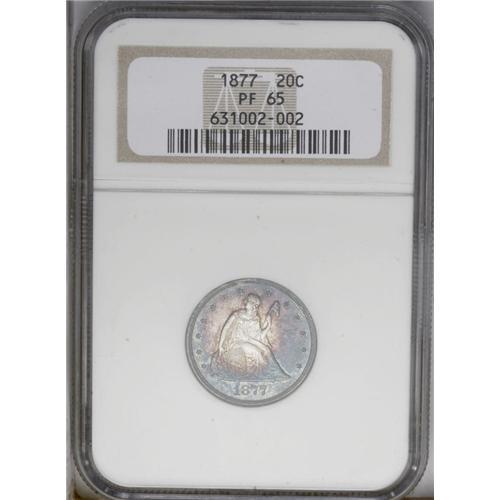 <B>1877<20C> PR65 NGC.</B></I> This is a wonderful Gem Cameo proof example, although it is not designated as a cameo proof by the grading service. Both sides have essentially brilliant centers, surrounded by lilac and blue color that is deeper on the obverse. The short-lived 20 cent denomination was coined for circulation only in 1875 and 1876, and then strictly in proof format for collectors during the next two years before being discontinued entirely. It was an experiment that was doomed to failure for many reasons.