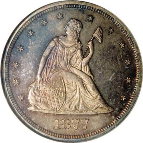 <B>1877 20C PR66 Cameo NGC.</B></I> The 1877 twenty cent piece is a proof-only issue with a mintage of just 350 coins. In his discussion on the melting of twenty cent pieces upon the denomination's abolition in 1878, Walter Breen, in his <I>Encyclopedia of United States and Colonial Proof Coins</B></I>, contends that, "... probably about 300 of the 1877's escaped the melting pot ... ," but that the issue "... is a little rarer than its low mintage would suggest ... ." Certainly coins designated Cameo are difficult to come by. NGC and PCGS have graded about 70 such examples, the majority as PR63 and PR64.<BR> A melange of medium intensity cobalt-blue, orange, lavender, and purple toning does not obscure the pronounced field-motif contrast on this Premium Gem Cameo. A powerful strike renders crispness to the design features, heightening even more the coin's outstanding eye appeal. The faces of both sides are well preserved. Census: 9 in 66 Cameo, 1 finer (7/07).<BR><BR><b>Shipping:</b> Coins & Currency (<a target="_blank" href="http://www.heritageauctions.com/common/shipping.php">view shipping information</a>\)