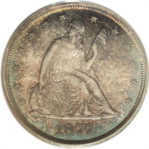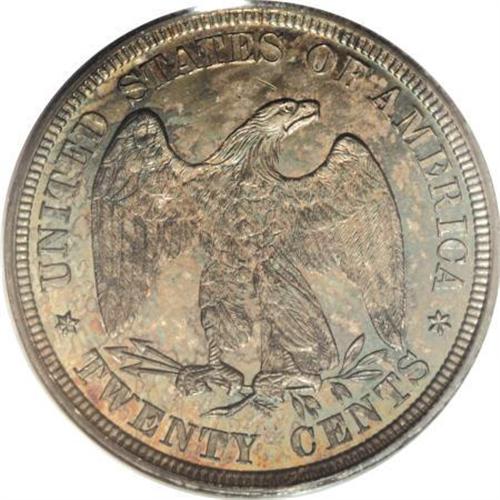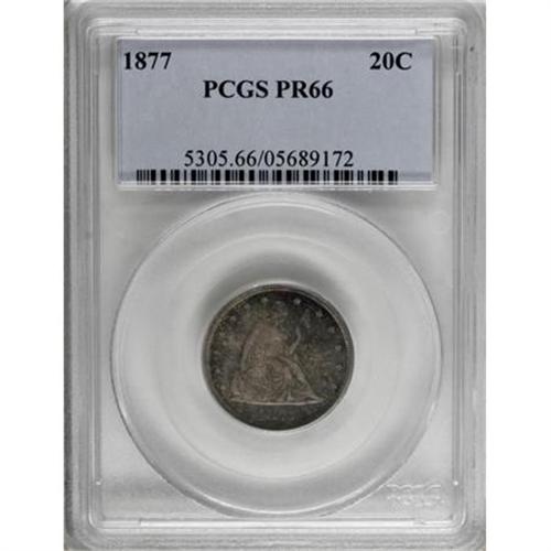 <B>1877 20C PR66 PCGS.</B></I> Walter Breen, in his 1977 <I>Encyclopedia of United States and Colonial Proof Coins</B></I>, writes that the 1877 proof-only twenty cent is a little rarer than its 350-piece mintage would suggest. He also indicates that "Many of the survivors are cleaned, some drastically so; and I have seen several damaged and 3 or 4 circulated ones." Many were also likely melted.<BR> This Premium Gem proof specimen displays a medley of medium intensity cobalt-blue, lavender, gold, and gray patina, that does not impede the striking field-motif contrast, especially when the coin is rotated beneath a light source. The strike is solid, imparting sharp and uniform definition to the design elements. Close inspection reveals just one trivial mark above the eagle's head, that we mention primarily because it may help in identifying this example for future catalogers. Population: 14 in 66, 0 finer (8/07).<BR><BR><B>Coin Engraver:</B> William Barber<BR><BR><b>Shipping:</b> Coins & Currency (<a target="_blank" href="http://www.heritageauctions.com/common/shipping.php">view shipping information</a>)