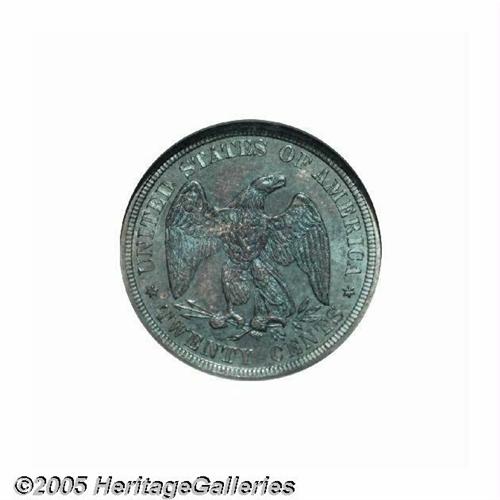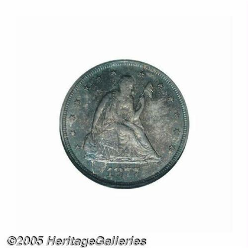 <B>1877<20C> PR67 NGC.</B></I> Toned with deep blue and russet colors over the entire obverse and reverse, and quite intense overall. The surfaces are outstanding as well, with no signs of handling or abuse, making this likely one of the very finest of this issue to survive. The proof striking is needle sharp, as expected, but rarely are these found so pristine and colorful. The total proof mintage for the year was 510 pieces and the strong demand from type collectors keeps all Twenty cent pieces under pressure. In fact, the combined NGC and PCGS Population reports note that just three coins of this date have been graded this high, with none seen finer. An opportunity for the specialist to put a great coin away.