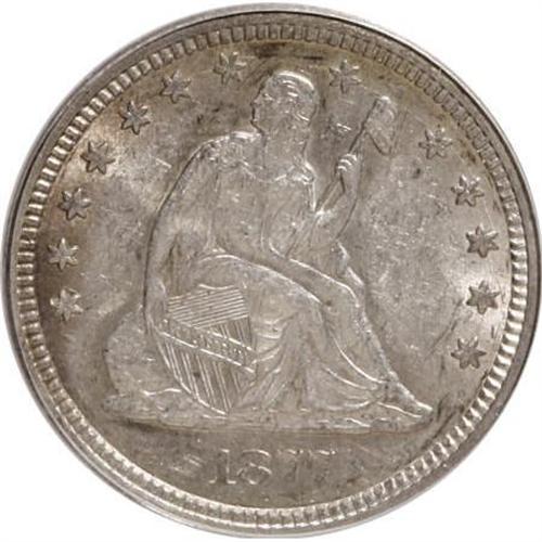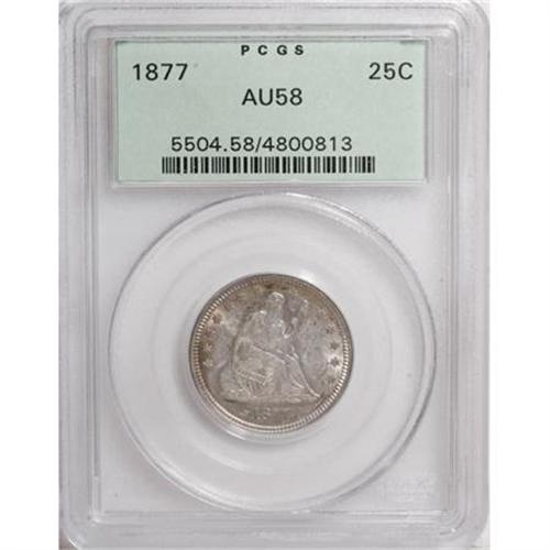 <B>1877 25C AU58 PCGS.</B></I> PCGS Population (22/270). NGC Census: (15/265). Mintage: 10,911,710. Numismedia Wsl. Price for NGC/PCGS coin in AU58: $160. (#5504)<BR><BR><B>Coin Engraver:</B> Christian Gobrecht<BR><BR><b>Shipping:</b> Coins & Currency (<a target="_blank" href="http://www.heritageauctions.com/common/shipping.php">view shipping information</a>)
