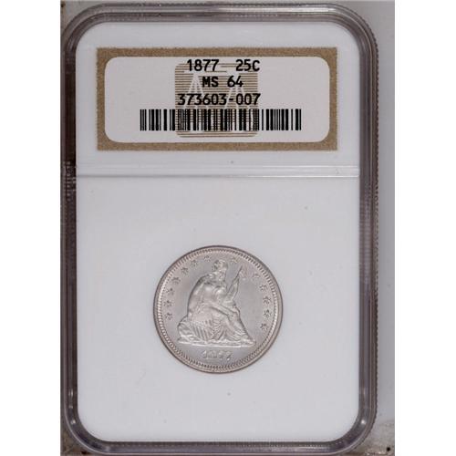 <B>1877<25C> MS64 NGC.</B></I> Type Two Reverse. An occasional wisp of gold hues grace this smooth near-Gem. The devices are meticulously struck, and the luster is vivacious on the reverse and suitable on the obverse.