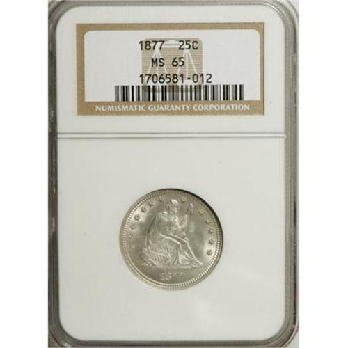 <B>1877 25C MS65 NGC.</B></I> Although a common date, Gems are elusive. This piece has full mint brilliance with intense white frost. All of the design elements on both sides are fully detailed.<BR><BR><b>Shipping:</b> Coins & Currency (<a target="_blank" href="http://www.heritageauctions.com/common/shipping.php">view shipping information</a>)