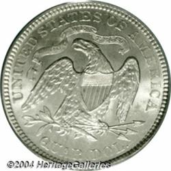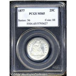 <B>1877<25C> MS65 PCGS.</B></I> The output of Seated Liberty Quarters reached its highest point during the years 1876 and 1877, with the supply of Mint State pieces greatly expanded by these six issues. The 1877, in particular, is known for its exceptional luster and high quality. This fully brilliant example, like many Uncirculated 1877 Quarters, displays rich, satiny luster. Most of the obverse stars and portions of the reverse legends show slight bluntness of strike, and a just a few trivial contact marks interrupt the otherwise impeccable fabric of this coin.<BR><I>From the JFS Collection.</B></I> <BR><BR><B>Important notice:</B> Heritage usually auctions material at the rate of 200-250 lots per hour. On some occasions eBay Live bid software or the Internet may not be able to keep up with the pace of the auction. We recommend placing a realistic absentee bid now as insurance to avoid disappointment. Occasionally the auctioneer may eliminate or reject an eBay Live bid, and the auctioneer may also reopen a lot after the close of the eBay live bidding (usually because we missed an audience bid), and may reject your bid even if it shows you as the winning bidder. By bidding via eBay Live, you agree that Heritage may award the lot to another bidder at its sole discretion under the circumstances described above or any other reasonable circumstances. Since eBay bids are not shown to us until we open the lot on the floor, we treat those bids just like floor bids. In most cases the floor responds before the eBay bid is presented to us, due to Internet lag time, so for consistency we have made it a policy that floor bids are always considered first over tie eBay live bids. Also please note that all Heritage lots purchased through eBay Live carry a 20% Buyer's Premium. Please make sure you read the Terms and Conditions before you bid. </span></font></tr></table></td></tr></table>