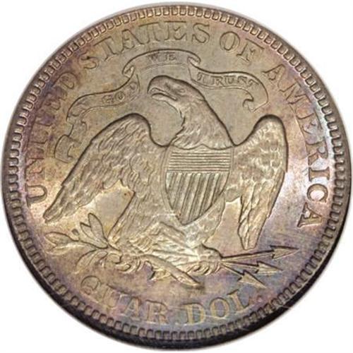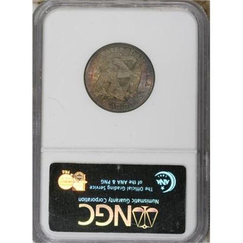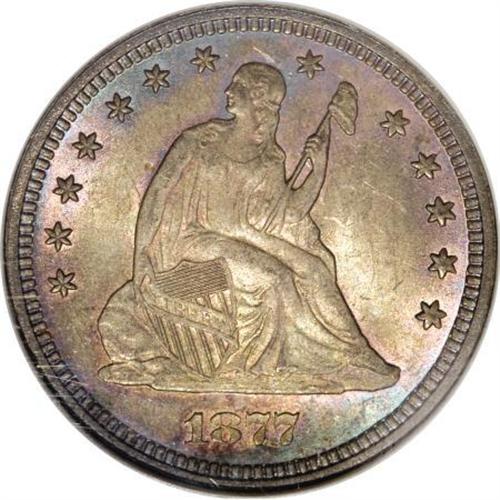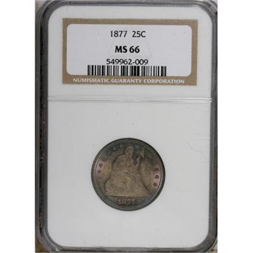 <B>1877 25C MS66 NGC.</B></I> Type Two Reverse. Production of Quarter dollars in all the mints peaked in 1876 and 1877. Almost 11 million pieces were struck in Philadelphia in 1877. This issue is also known for its exceptional luster and high quality, the combination of which makes it a perfect coin for type purposes. As expected, this piece has outstanding mint luster, distinctly frosted in nature, and colorfully toned throughout. A mixture of deep crimson and sea-green colors amply decorate each side. Just a few minor ticks are noted in the obverse field that are nearly obscured by the toning. Census: 43 in 66, 33 finer (6/07).<BR><BR><b>Shipping:</b> Coins & Currency (<a target="_blank" href="http://www.heritageauctions.com/common/shipping.php">view shipping information</a>)