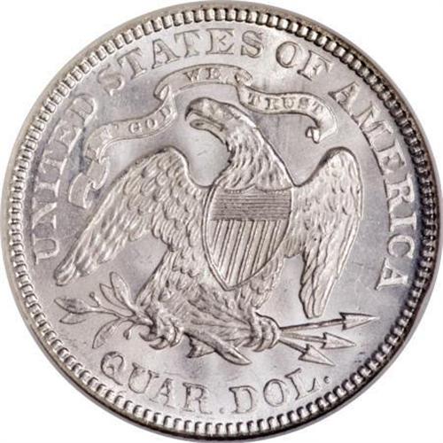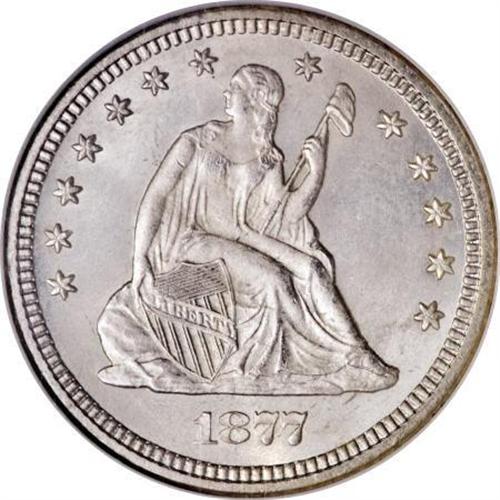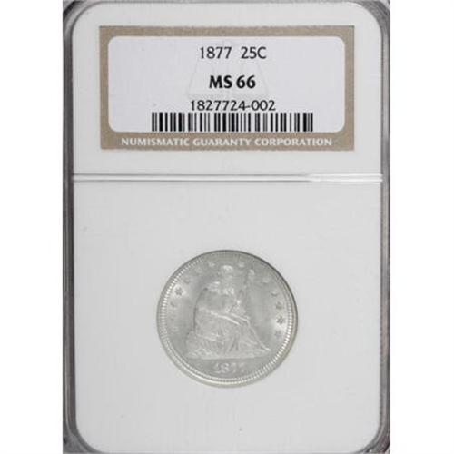 <B>1877 25C MS66 NGC.</B></I> Type Two Reverse. A glacially white representative of the With Motto design type, this Premium Gem has frosty silver surfaces and bold design elements. Examples at this grade level are not particularly hard to locate, given some time to search. Seeking just the right example from the present population will require effort. Here is a piece that should please the connoisseur. Census: 42 in 66, 36 finer (1/08).<BR><I>From The Southwest Collection.</B></I><BR><BR><B>Coin Engraver:</B> Christian Gobrecht<BR><BR><b>Shipping:</b> Coins & Currency (<a target="_blank" href="http://www.heritageauctions.com/common/shipping.php">view shipping information</a>)
