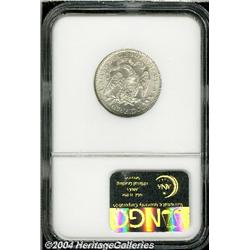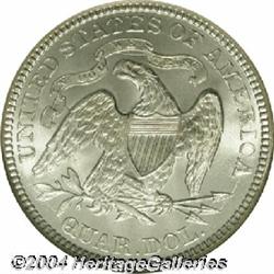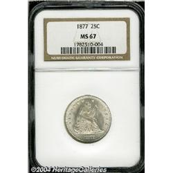 <B>1877<25C> MS67 NGC.</B></I> Production of Quarter Dollars in all the mints peaked in 1876 and 1877. Almost 11 million pieces were struck of the 1877-P. This issue is also known for its exceptional luster and high quality, the combination of which makes it a perfect coin for type purposes. As expected, this piece has outstanding mint luster, distinctly frosted in nature, and it is fully brilliant throughout. Just a few minor ticks are noted in the right obverse field. Population: 32 in 67, 5 finer (9/04). <BR><BR><B>Important notice:</B> Heritage usually auctions material at the rate of 200-250 lots per hour. On some occasions eBay Live bid software or the Internet may not be able to keep up with the pace of the auction. We recommend placing a realistic absentee bid now as insurance to avoid disappointment. Occasionally the auctioneer may eliminate or reject an eBay Live bid, and the auctioneer may also reopen a lot after the close of the eBay live bidding (usually because we missed an audience bid), and may reject your bid even if it shows you as the winning bidder. By bidding via eBay Live, you agree that Heritage may award the lot to another bidder at its sole discretion under the circumstances described above or any other reasonable circumstances. Since eBay bids are not shown to us until we open the lot on the floor, we treat those bids just like floor bids. In most cases the floor responds before the eBay bid is presented to us, due to Internet lag time, so for consistency we have made it a policy that floor bids are always considered first over tie eBay live bids. Also please note that all Heritage lots purchased through eBay Live carry a 20% Buyer's Premium. Please make sure you read the Terms and Conditions before you bid.