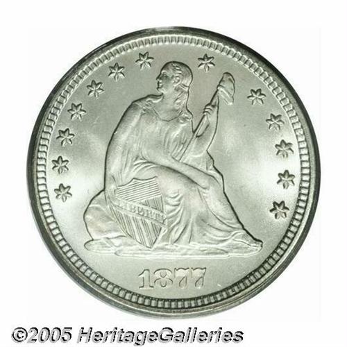 <B>1877<25C> MS67 PCGS.</B></I> The output of Seated Liberty Quarters reached its zenith during the years 1876 and 1877, with the supply of Mint State pieces greatly expanded by these six issues. The 1877, in particular, is known for its exceptional luster and high quality. This fully brilliant example, like many superb 1877 Quarters, displays soft, satiny luster equally placed over each side. Sharply defined overall with complete definition even on the right obverse stars. A few mint made clashmarks are noted on each side, but the do not detract. Definitely a premium example. Population: 36 in 67, 1 finer (4/05).