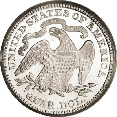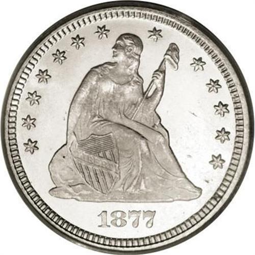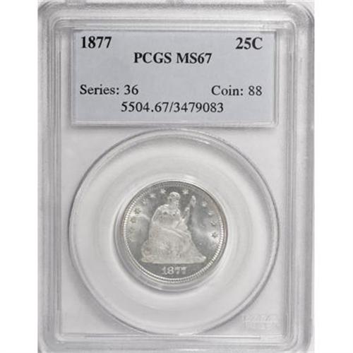 <B>1877 25C MS67 PCGS.</B></I> Type Two Reverse. This is an awesome representative of the 1877 Seated quarter issue, with intense mint frost over both sides and shimmering, untoned silver surfaces. The striking details are impressively bold, even if slightly weak in a few selected areas of the obverse. A common date, but scarce at the Superb Gem level. Population: 41 in 67, 1 finer (11/07). <BR><I>From The Pinetop Collection.</B></I><BR><BR><B>Coin Engraver:</B> Christian Gobrecht<BR><BR><b>Shipping:</b> Coins & Currency (<a target="_blank" href="http://www.heritageauctions.com/common/shipping.php">view shipping information</a>)