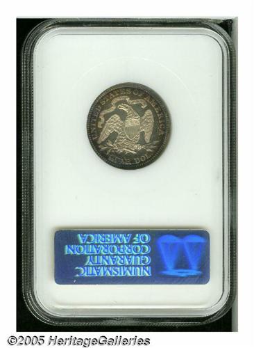 <B>1877<25C> PR65 NGC.</B></I> This lovely proof, one of 510 pieces minted, displays lavender and cobalt-blue peripheral toning, which is more extensive on the reverse. The centers are brilliant, and present moderate motif-field contrast. The design elements are exquisitely struck and frosty. A few wispy hairlines are noted in the fields, but do not really detract from the coin's overall eye appeal. NGC and PCGS have certified a total of only 32 pieces at this level, and 18 finer (5/05). Moreover, our records show that the major auction houses have offered 15 PR65 coins over the past 15 years, and just six grading higher. Population: 19 in 65, 12 finer (5/05).
