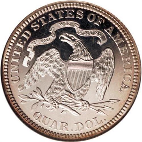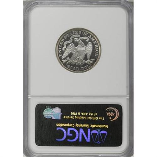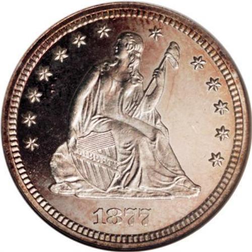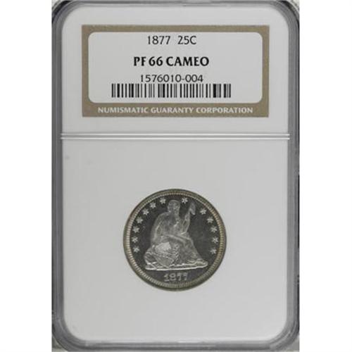 <B>1877 25C PR66 Cameo NGC.</B></I> Type Two Reverse. This Premium Gem Cameo proof displays whispers of light tan-gold patina, most noticeable around the obverse border. Well frosted design elements stand out against deeply mirrored fields, and exhibit an attentive strike. Some minute milling marks between stars 3 and 4 serve to pedigree the coin. Census: 4 in 66, 1 finer (8/07).<BR><BR><b>Shipping:</b> Coins & Currency (<a target="_blank" href="http://www.heritageauctions.com/common/shipping.php">view shipping information</a>)