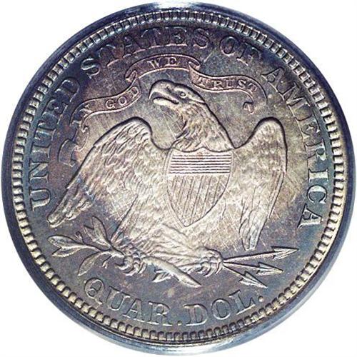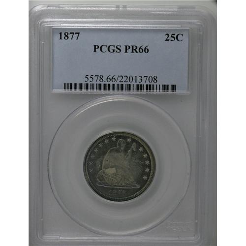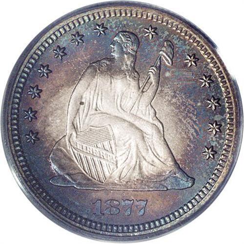 <B>1877<25C> PR66 PCGS.</B></I> Dusky gray and rose toning in the centers gives way to an array of crimson, indigo, and olive around the peripheral glassy surfaces. A few irregular toning streaks are noticed in the center of the reverse. Rarely found as a cameo, this is one of the finer 1877 proof quarters available and a prize for the color enthusiast. Population: 5 in 66, 2 finer (8/06).