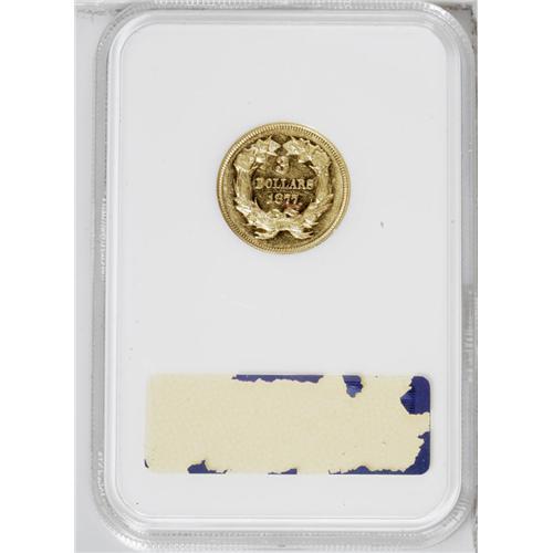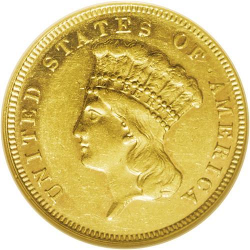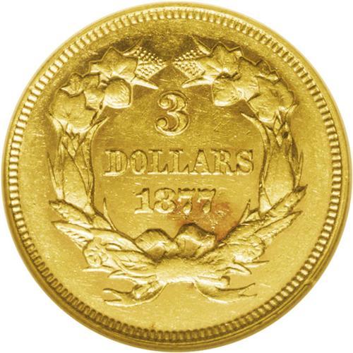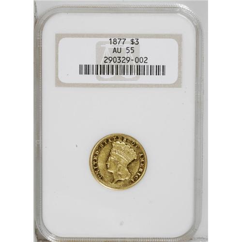 <B>1877<$3> AU55 NGC.</B></I> Gold coins did not circulate on the East Coast in 1877, although that situation would change in a couple of years. The Philadelphia Mint struck only minimal quantities of most gold denominations, with the exception of the double eagle, which had export and bank reserve purposes. The 1877 three dollar gold piece had a tiny emission of 1,468 business strikes and 20 proofs. Presumably, the business strikes were coined only to keep the proofs from becoming major contemporary rarities, which had been the case for the 1875 and 1876 proof-only issues. Surprisingly few 1877 pieces were set aside. As of (6/06), NGC has certified only four Mint State examples. This unmarked representative has plentiful prooflike luster in recessed areas, and is problem-free save for a rose-russet spot above the right ribbon loop. Encapsulated in a former generation holder.<BR><I>From The Derrick Snider Collection.</B></I>