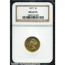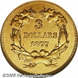 <B>1877 $3 MS62 Prooflike PCGS.</B></I> It is a curious phenomenon that the 1877 is one of the least appreciated issues in this series, and at the same time is an issue with an original mintage of only 1,468 business strikes. Perhaps this is because of the absolute rarity of all Three Dollar gold pieces, or perhaps it is because there are so many low mintages in the series. Whatever the case, this is a worthwhile issue for the specialist to pursue and this is certainly a pleasing coin. The fields retain most of the original full prooflike reflectivity that all specimens of this date are known for. Striking definition is less than complete, however, especially on the reverse. Some small marks and pronounced scuffiness in the fields combine to limit the assigned grade. Population: 1 in 62, 1 finer (2/05).