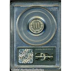 <B>1877<3CN> PR64 PCGS.</B></I> Breen-2437. This example is what Breen lists as the 1877/6 variety, with repunching at the base of the 1 and traces of a 6 to the left of the final digit. However, Flynn and Fletcher in their book entitled <I>The Authoritative Reference on Three Cent Nickels,</B></I> suggest that what Breen probably thought was the remnant of a 6 beneath the final 7 is actually a die scratch. They also point out that the location, shape, and contour of this metal on the left side of the 7 does not match that of a 6 from an 1876 issue, thus concluding that this variety cannot be classified as an overdate. Whatever the case, the present example is sharply struck, reveals a subtle veil of gold toning, and appears to be free of any significant contact marks or unsightly spots. As a proof only issue with an estimated production of approximately 510 pieces, it is a key date in the Three Cent Nickel series. Population: 144 in 64, 196 finer (3/04).<BR><I>From The Velma & Bowie Lynch Collection, Part Four.</B></I> <BR><BR><B>Important notice:</B> Heritage usually auctions material at the rate of 200-250 lots per hour. On some occasions eBay Live bid software or the Internet may not be able to keep up with the pace of the auction. We recommend placing a realistic absentee bid now as insurance to avoid disappointment. Occasionally the auctioneer may eliminate or reject an eBay Live bid, and the auctioneer may also reopen a lot after the close of the eBay live bidding (usually because we missed an audience bid), and may reject your bid even if it shows you as the winning bidder. By bidding via eBay Live, you agree that Heritage may award the lot to another bidder at its sole discretion under the circumstances described above or any other reasonable circumstances. Since eBay bids are not shown to us until we open the lot on the floor, we treat those bids just like floor bids. In most cases the floor responds before the eBay bid is presented to us, due to Internet lag time, so for consistency we have made it a policy that floor bids are always considered first over tie eBay live bids. Also please note that all Heritage lots purchased through eBay Live carry a 20% Buyer's Premium. Please make sure you read the Terms and Conditions before you bid. </span></font></tr></table></td></tr></table>