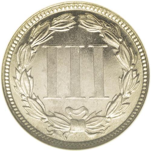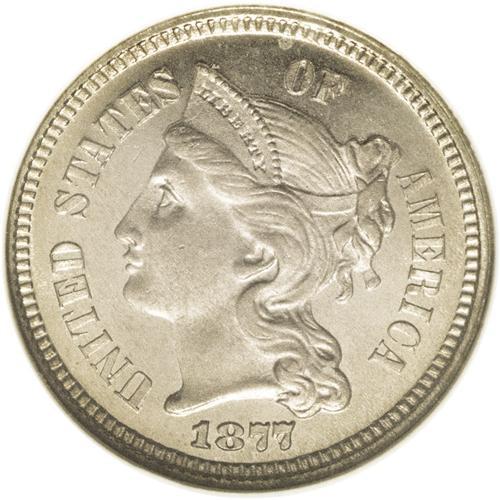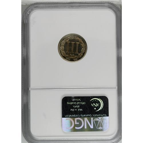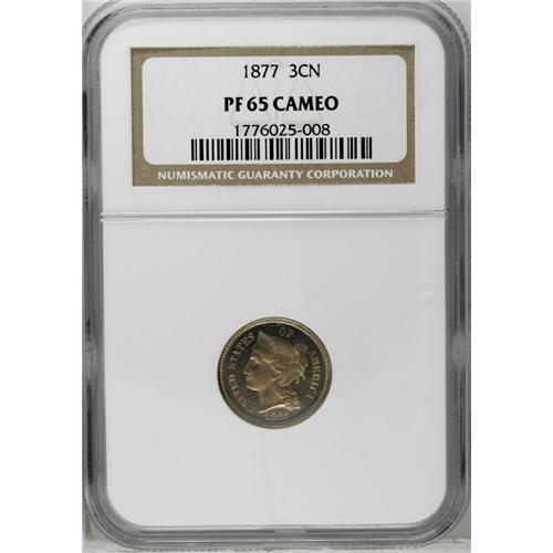 <B>1877<3CN> PR65 Cameo NGC.</B></I> Both sides of this Gem Cameo proof have deep golden toning over lustrous surfaces with deeply mirrored fields. This is a proof-only issue from an unknown original mintage, historically recorded as 510 pieces, although we believe the true mintage was probably closer to 1,500 coins. Dave Bowers once estimated a mintage of 1,250 to 1,500 coins for the 1877 proof Indian cent, and we believe that similar figures apply to the 1877 three cent piece and the 1877 Shield nickels, both proof-only dates.