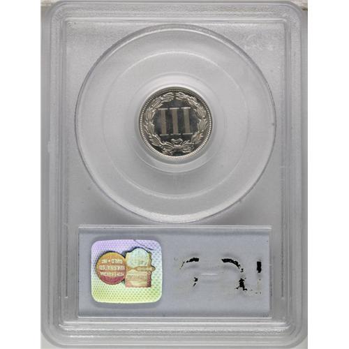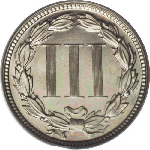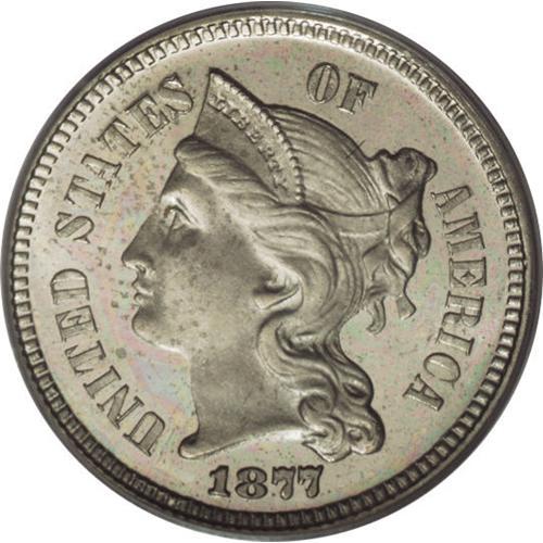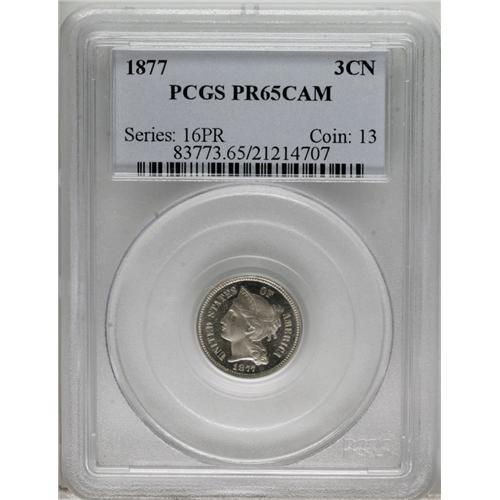 <B>1877 3CN PR65 Cameo PCGS.</B></I> Sharply struck and beautifully preserved, this Gem example displays unmistakable cameo contrast on each side, with reflective fields and lightly frosted devices. 1877 was a proof-only year for the three cent nickel, and a mere 510 pieces were reportedly minted, making this a valuable and scarce key date in the series.<BR><BR><b>Shipping:</b> Coins & Currency (<a target="_blank" href="http://www.heritageauctions.com/common/shipping.php">view shipping information</a>)