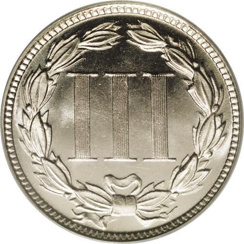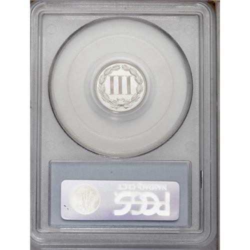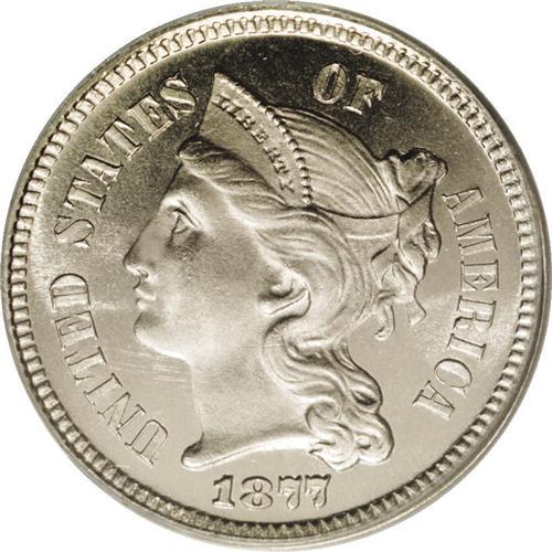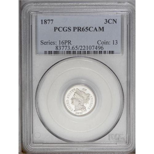 <B>1877<3CN> PR65 Cameo PCGS.</B></I> This is a popular date inasmuch as it boasts the lowest total mintage in the 1865-1889 three cent nickel series. At least 510 pieces were produced, all in proof format. There is no toning on either side, a feature that allows full appreciation of the glowing fields and their degree of contrast with the frosty textured devices. Sharply struck throughout with no singularly distracting marks or hairlines to report. Population: 18 in 65 Cameo, 32 finer (1/06).