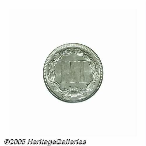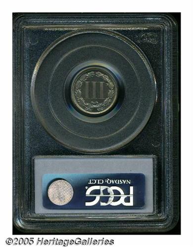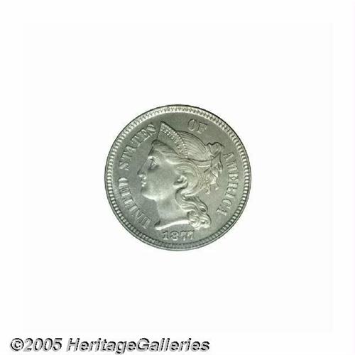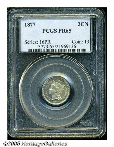 <B>1877<3CN> PR65 PCGS.</B></I> Only 510 pieces were struck of this scarce proof-only date. Moderately mirrored fields with no mentionable distractions, there is a slight accent of rose patina over the right side of the obverse. Worthy of a fine collection. Population: 140 in 65, 53 finer (6/05).