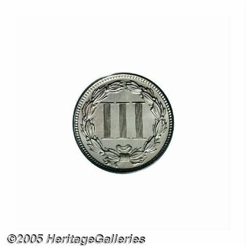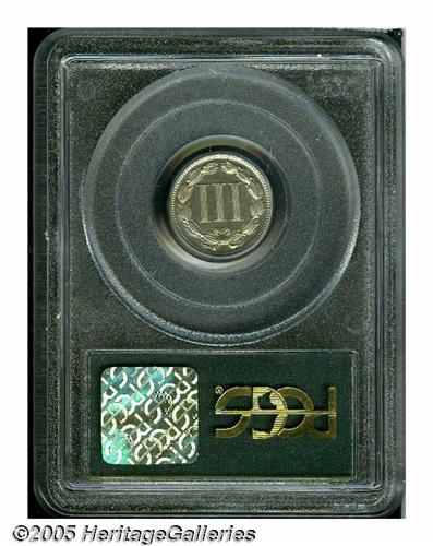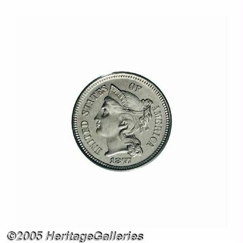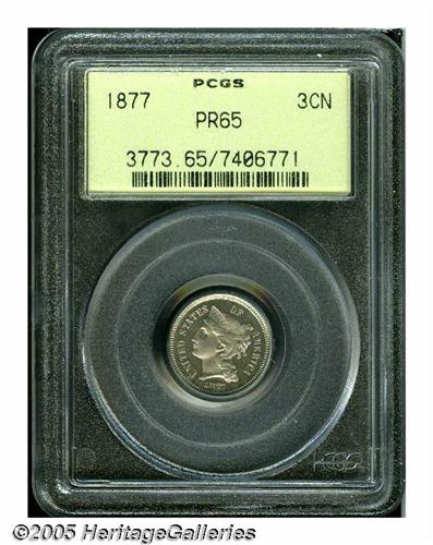<B>1877<3CN> PR65 PCGS.</B></I> This and the proof 1865 are the key issues in the Three Cent Nickel series. Unlike the 1865, however, no business strikes are available of the 1877. Only 510 proofs were produced, putting tremendous date pressure on this issue. This is a deeply mirrored example that is mostly brilliant but shows a pale overlay of silver-gray toning over each side.