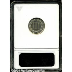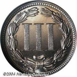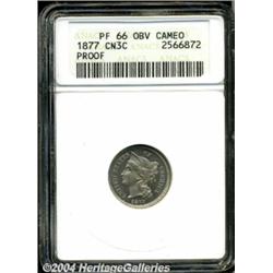 <B>1877<3CN> PR66 ANACS.</B></I> A shimmering example of this proof-only year, and certainly one of the finer specimens that we have seen. Only 510 pieces were originally coined. The mirrored surfaces are accented with gentle gray patina. <BR><BR><B>Important notice:</B> Heritage usually auctions material at the rate of 200-250 lots per hour. On some occasions eBay Live bid software or the Internet may not be able to keep up with the pace of the auction. We recommend placing a realistic absentee bid now as insurance to avoid disappointment. Occasionally the auctioneer may eliminate or reject an eBay Live bid, and the auctioneer may also reopen a lot after the close of the eBay live bidding (usually because we missed an audience bid), and may reject your bid even if it shows you as the winning bidder. By bidding via eBay Live, you agree that Heritage may award the lot to another bidder at its sole discretion under the circumstances described above or any other reasonable circumstances. Since eBay bids are not shown to us until we open the lot on the floor, we treat those bids just like floor bids. In most cases the floor responds before the eBay bid is presented to us, due to Internet lag time, so for consistency we have made it a policy that floor bids are always considered first over tie eBay live bids. Also please note that all Heritage lots purchased through eBay Live carry a 20% Buyer's Premium. Please make sure you read the Terms and Conditions before you bid. </span></font></tr></table></td></tr></table>